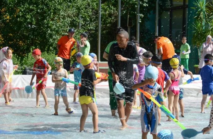 孩子们在水池中大笑、追逐、奔跑、射击,